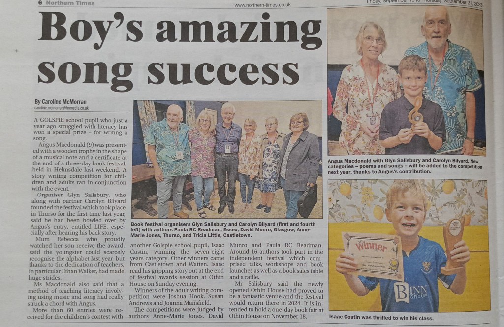 An article from the Northern Times concerning last weekend’s festival. On the final day following author presentations, there are school pupil competitons where authors form a panel to decide winners. I’m third from left.
